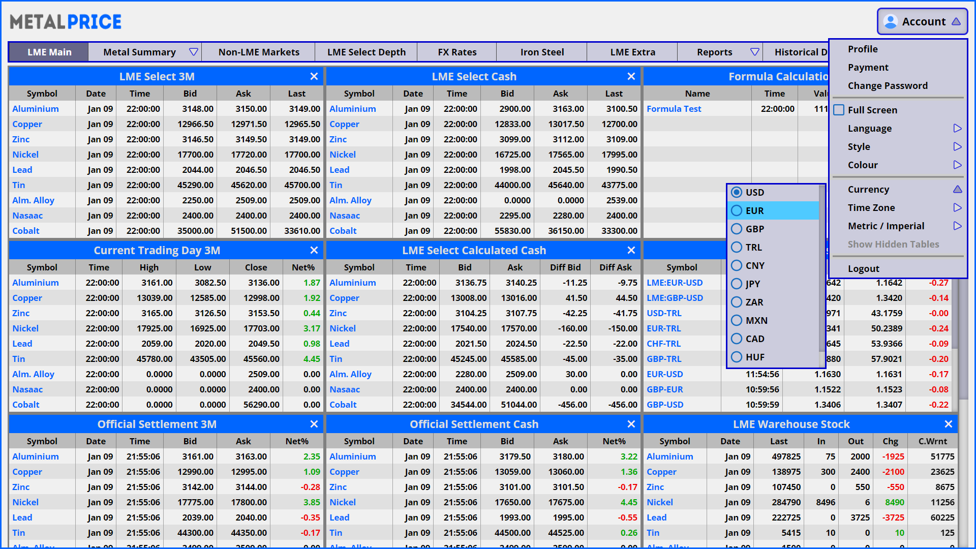 All the prices quoted by London Metal Exchange are in US Dollars. metalprice.live enables you to switch between main currencies and you can track LME quotations in EUR, GBP, TRL, CNY. With one click, You can change all prices on metalprice.live to your desired currency.