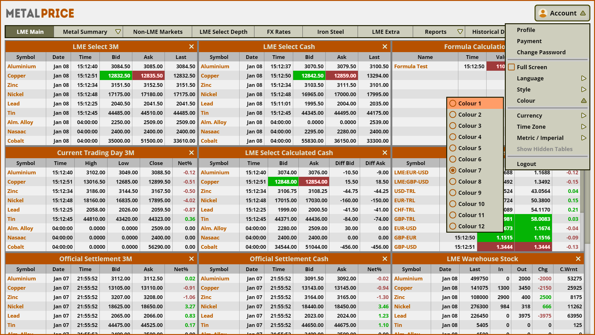 metalprice.live enables you customize your own screen. You can use different colouring options, place pricing boxes where you want them to see. Layout of the fixed tables can be arranged to your liking.
